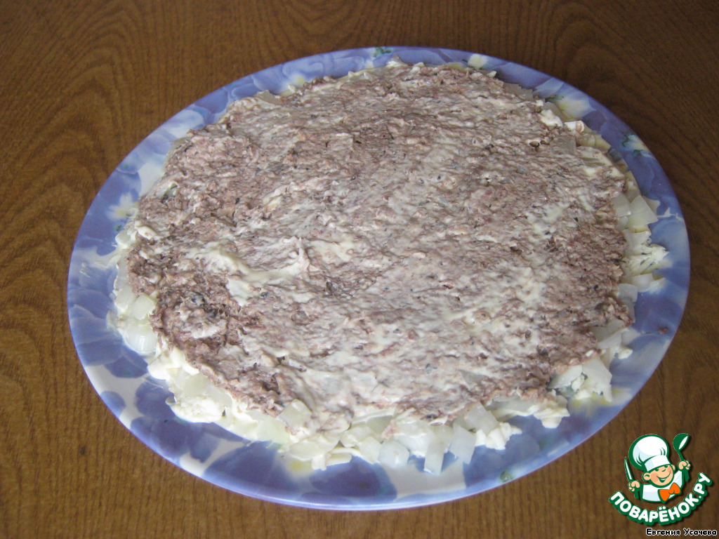 Затем "Сайру" разминаем вилкой, не сливая масла. Выкладываем на лучок. Также смазываем майонезом.