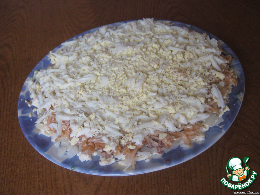 И последний шаг - трем на мелкой терке белки и равномерно распределяем по поверхности салата. Вот такой кучерявый салатик получился!!!