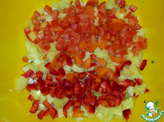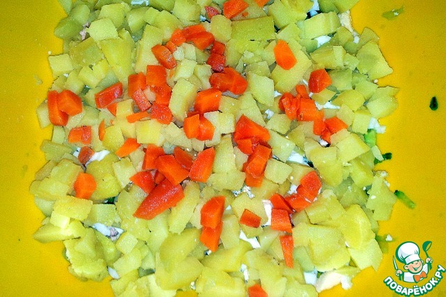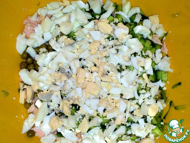 Посолить, поперчить и всё перемешать. Лук репчатый и зелёный добавить только перед подачей, иначе он будет горьким и неприятным на вкус. Заправить майонезом тоже перед подачей.