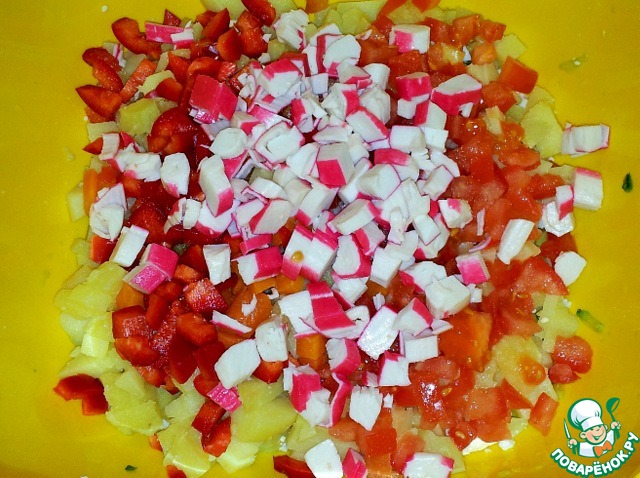 В ёмкость ко всему добавить некрупно нарезанные крабовые палочки.