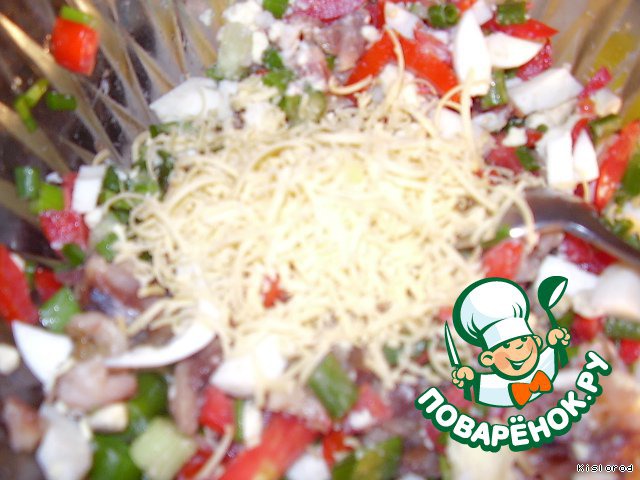 Все складываем в салатницу, добавляем натертый на мелкой терке твердый сыр