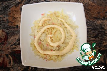 Итак, первый слой - вареная картошка, натертая на крупной терке. Полить майонезом