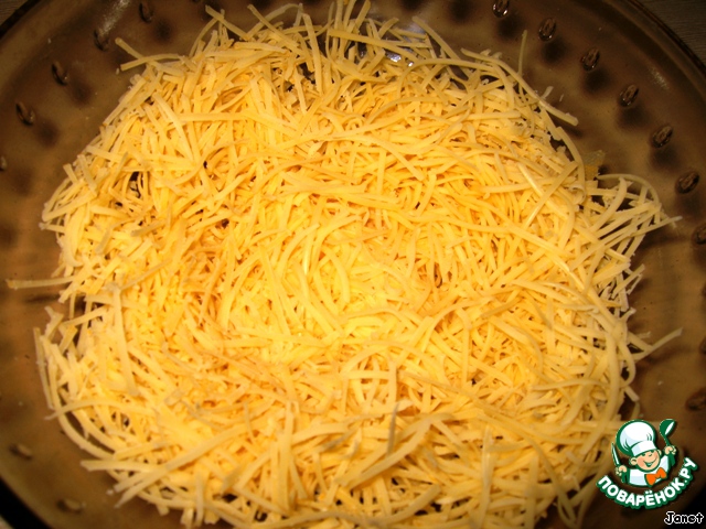 Потереть сыр на мелкой тёрке на дно салатника. Смазывать майонезом каждый слой.