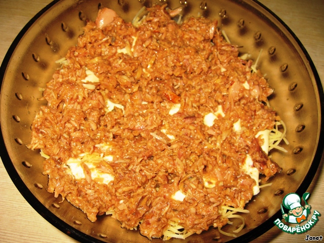 Выложить сверху тунец, размятый вилкой.