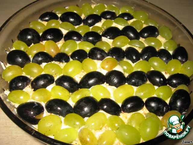 Виноград очистить от косточек, разрезать пополам и выложить сверху в виде рисунка. У меня полосатик!:)