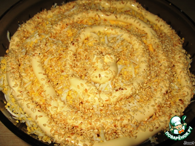 Посыпать обжаренными кунжутными семечками.