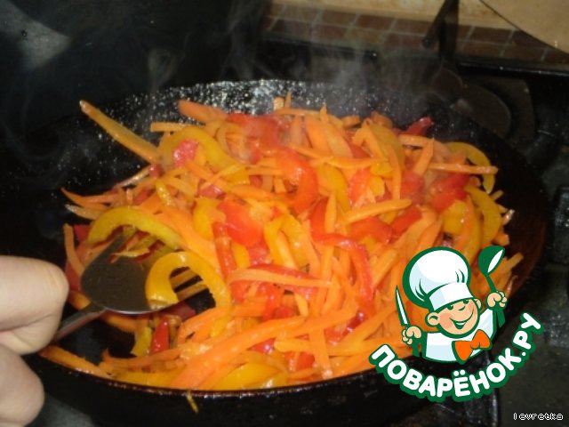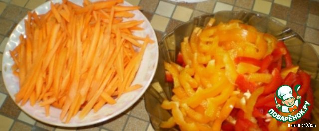 Если вы не добавляли лук в маринад, то тогда берем лук, морковь, болгарский сладкий перец, режем все овощи соломкой