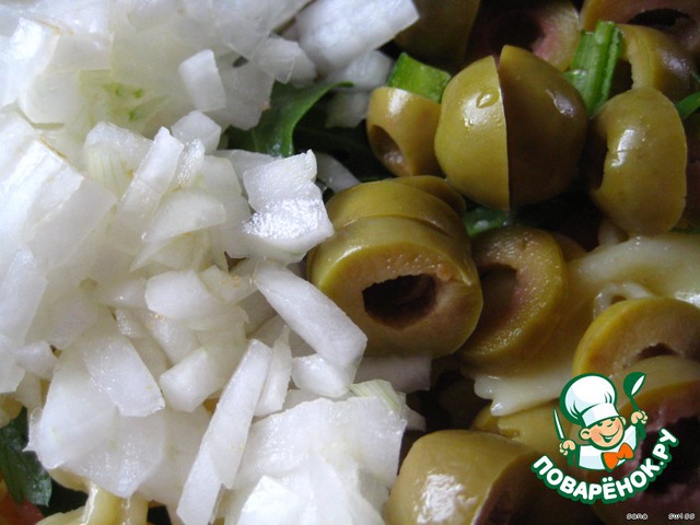 измельченный лук, оливки, разрезанные на 2-3 части,