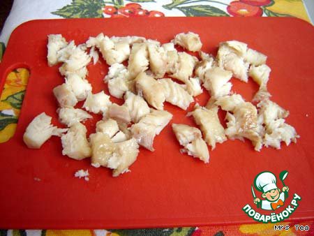Отварить или пожарить рыбное филе (я запекла в микроволновой печи). Остудить и нарезать кусочками.