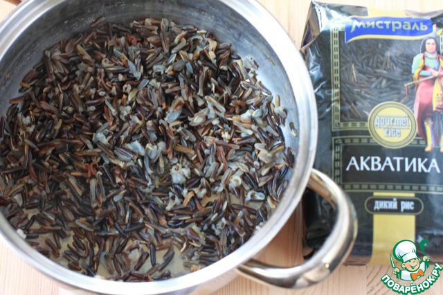Дикий рис следует заранее отварить, на 1 часть риса берется 3 части воды. Готовность дикого риса можно определить по потрескавшимся зернам.