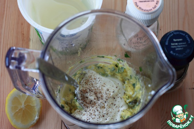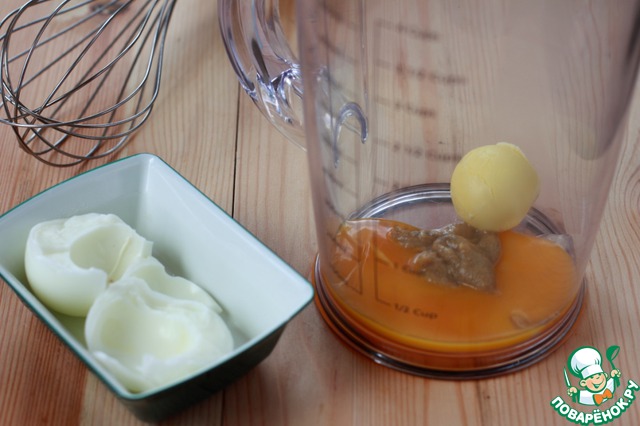 Отварите яйцо. В емкость поместите отварной желток, сырой желток и чайную ложку горчицы.