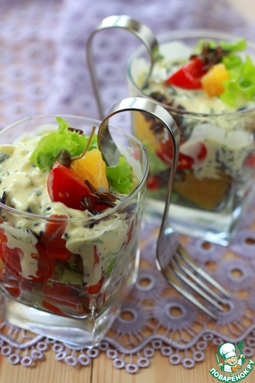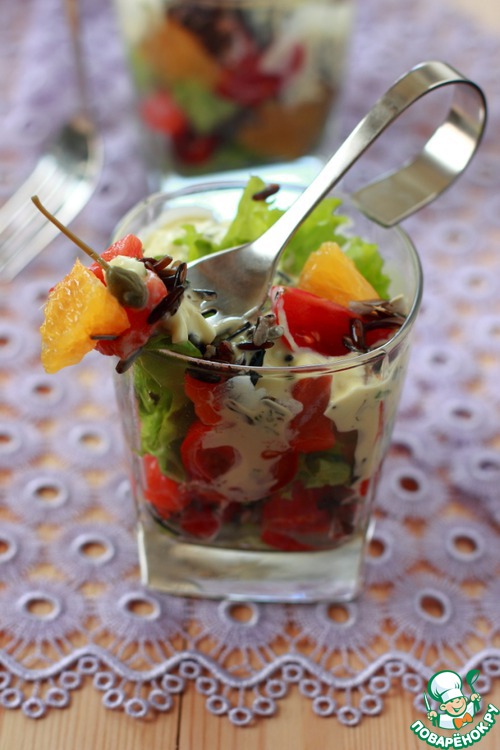 *Салат можно подать и на блюде - на листьях салата живописно разложите черри, апельсины, копченую форель, посыпьте диким рисом и полейте тартаром.