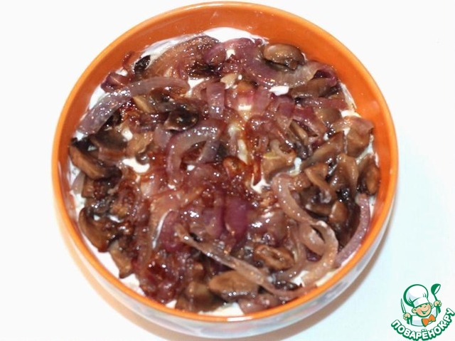 Подготовим продукты для салата. Грибы порезать дольками и пережарить с нарезанным репчатым луком. Сельдь почистить и порезать кубиками. Картофель, морковь и яйца отварить, почистить и отдельно натереть на крупной терке. Зеленый лук мелко порезать.