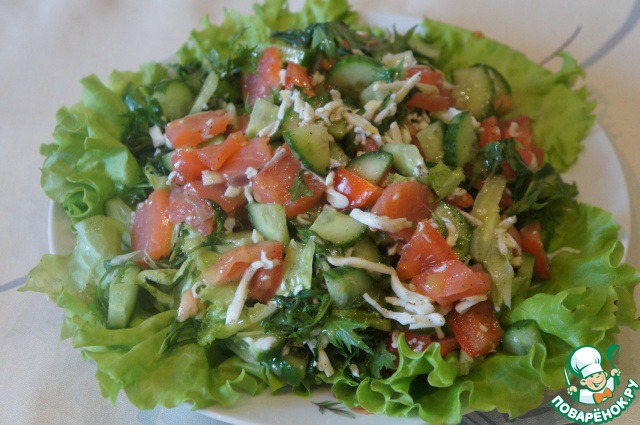 | Очень легкий и вкусный салатик для любителей красной рыбки. А кто ее не любит? |