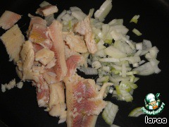 Лук меленько порезать. Сковороду нагреть, влить 1 ст.л. растительного масла и положить лук. Сегка обжарить, добавить крупно порезанную рыбу и слегка потомить.