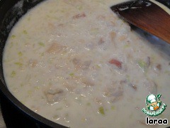 Добавить 100 г сливок и молоко, довести до кипения, убавить огонь и поварить минут 15.
