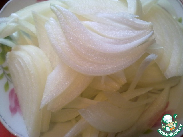 Чистим лук, разрезаем на четвертинки, а каждую четвертинку режим на лепестки.