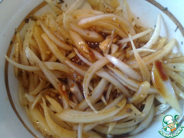 Затем лук кладем в маринад, добавляем выдавленный через пресс чеснок и все тщательно перемешиваем. Ставим в холодильник на 1 час.