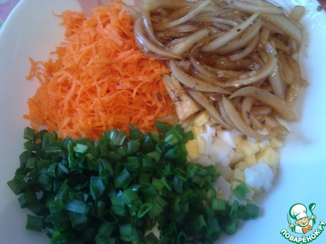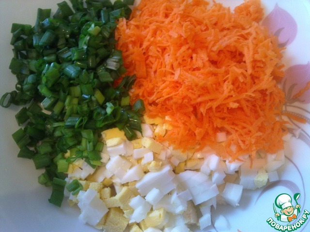 Яйца отварить вкрутую, очистить и мелко нарезать. Добавить мелко нарезанный зеленый лук и натертую на мелкой терке морковь.