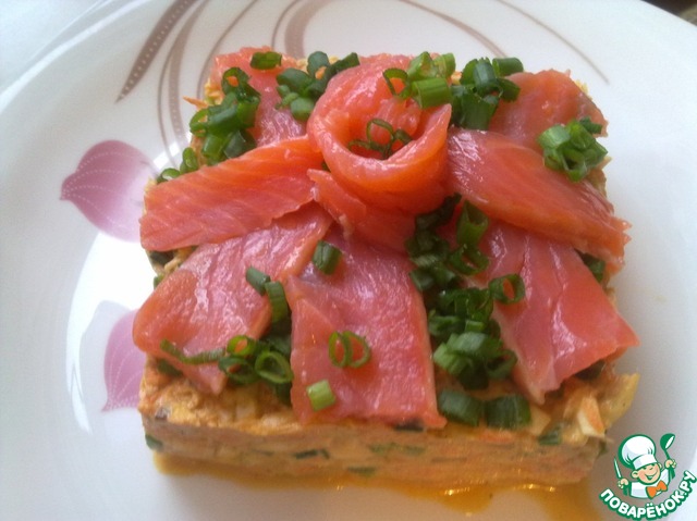 Салат я выложила в квадратную форму, украсила его нарезанной слабосоленой форелью и посыпала зеленым луком. Ставим салат в холодильник на 30 минут, затем снимаем форму, оформляем листьями салата и подаем к столу.