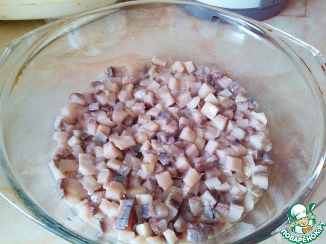 Сельдь мелко режем и выкладываем в сервировочную салатницу. Сразу оговорюсь, что я всегда использую именно филе в масле. Знаю, что не соответствует классическому рецепту, но мы с мужем любим именно такой вариант.