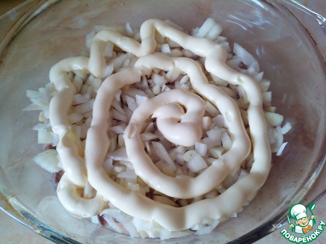 Репчатый лук мелко режем, выкладываем поверх сельди и смазываем майонезом.