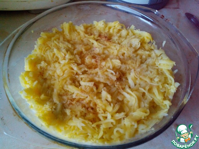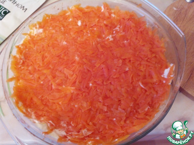 Морковь натереть на крупной терке. Выложить поверх картофеля, посолить, поперчить и смазать майонезом.