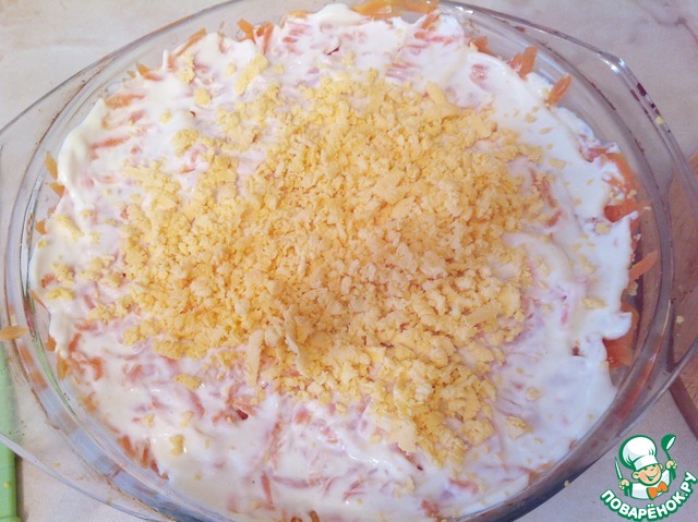 Так как в данном варианте декорирования желток нам не нужен, а выбрасывать жалко, я натерла его поверх морковки и не смазывала майонезом. Если декор будет другим, то этот шаг можно пропустить.