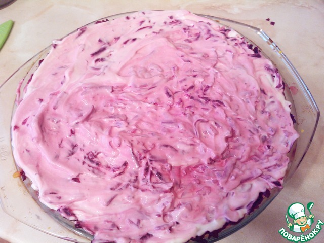 Свеклу натираем на крупной терке. Выкладываем поверх моркови и яичного желтка и смазываем майонезом. Далее можно приступать к декорированию.