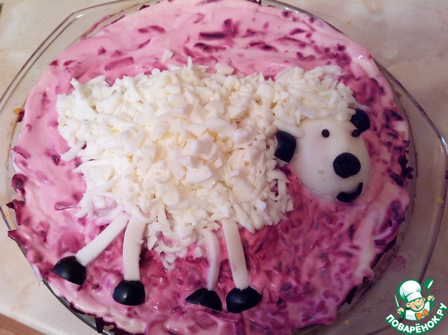 Яйца чистим. Одно откладываем в сторону. Белки натираем на крупной терке. Оставшееся яйцо разрезаем пополам. Это будет мордочка нашей овечки. На ней делаем глазки из горошин чёрного перца, нос и рот из оливки. Кладем ее на наш салат. Из натертого белка делаем тело и шерсть на голове. Из оливки выкладываем уши. Из оставшейся половинки яйца вырезаем ноги, остаток измельчаем и добавляем к нашему "телу". Из оливки делаем копытца.