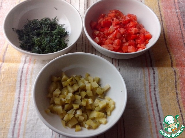 Помидоры, маринованные огурцы (срезать кожуру)- нарезать мелким кубиком, укроп-мелко порезать.