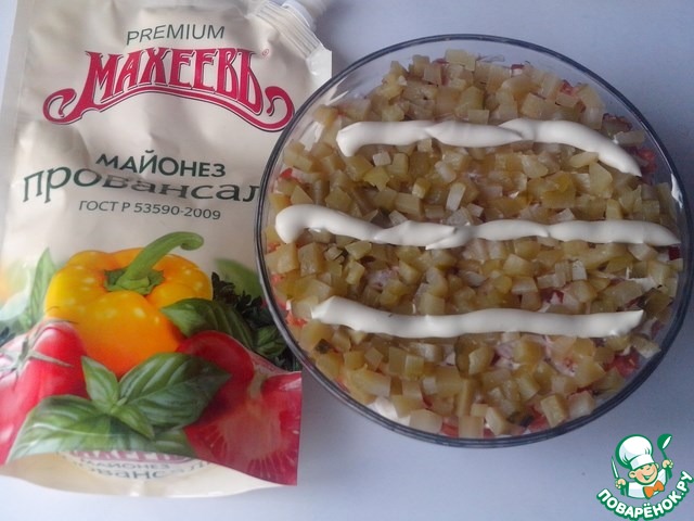 1 слой - свежий огурец + майонез. Я использовала майонез Провансаль ТМ "Махеев."