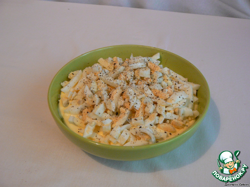Сваренные в крутую яйца, безжалостно порубить (не такие они и крутые). Посыпать останками содержание салатницы. И! Мельничкой, смолоть черный перец.