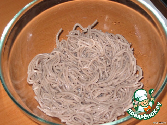 Один пучок гречневой лапши отварить и остудить.