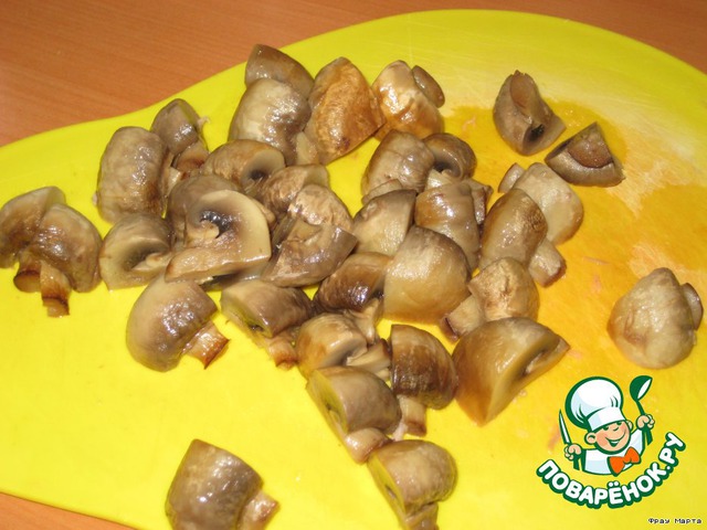 Шампиньоны порезать на четыре части и слегка обжарить на растительном масле. Затем выложить на салфетку, чтоб масло стекло.