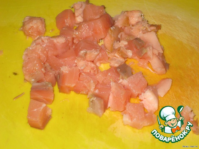 Семгу порезать кубиками.
