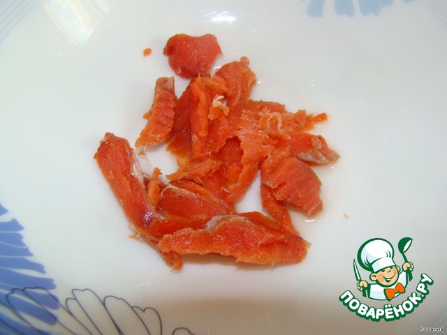 Сёмгу порежем на небольшие пластинки, вынимая косточки, и закладываем в тарелочки.