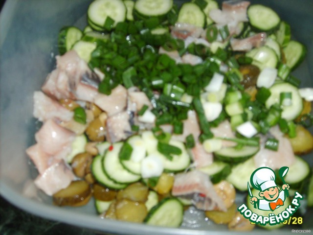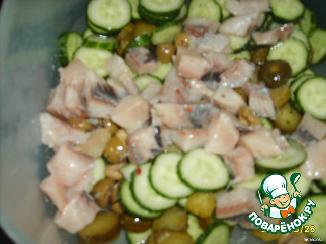 Режем огурцы и корнишоны кружочками, добавляем селёдку, нарезанную немелкими кубиками
