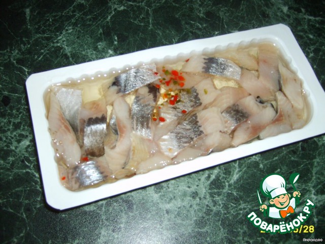Берём селёдку, у меня филе кусочками, но любителям возиться с селёдочными костями можно взять и целую.