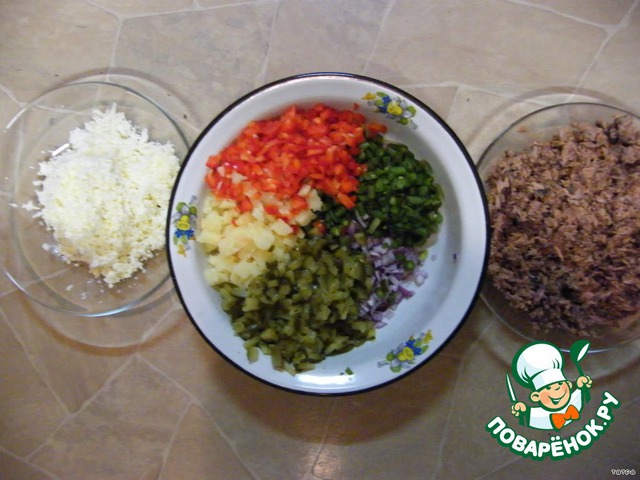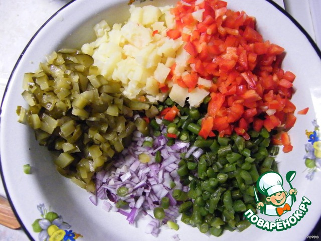 Нарезать как можно мельче репчатый лук, болгарский перец, соленые огурцы, вареные яйца и вареный картофель.