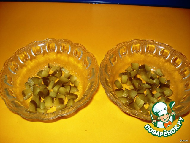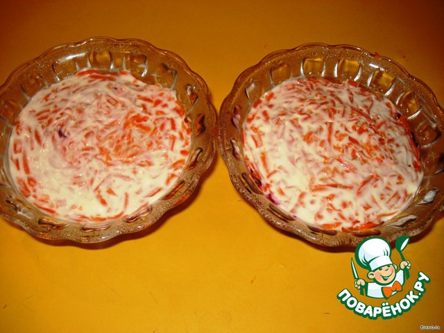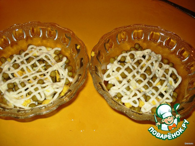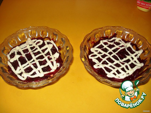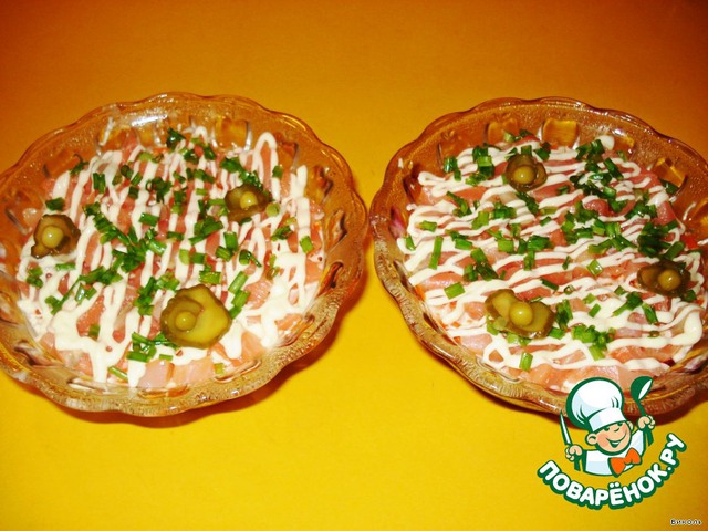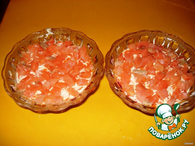 | Что-то типа "Селедка под шубой", только рыбка другая, и она выкладывается сверху. |