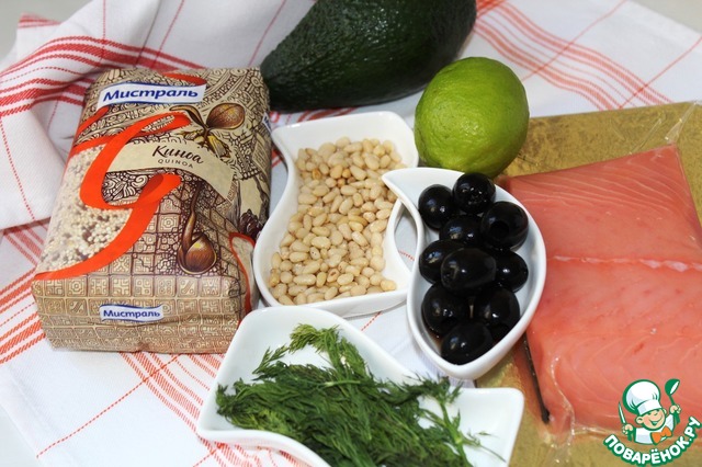Отварила киноа, согласно инструкции на упаковке (это время не брала в расчет). Маслины нарезала тонкими кольцами, семгу - тонкими ломтями по всей длине куска. В чашку блендера поместила половинку авокадо (очищенную от кожуры и нарезанную кубиками), обжаренные на сухой сковороде кедровые орешки, зелень укропа (грубые стебли предварительно оборвала) немного соуса табаско (1 ч. л.) и пару ложек лаймового сока, посолить.