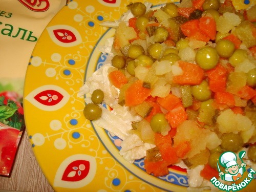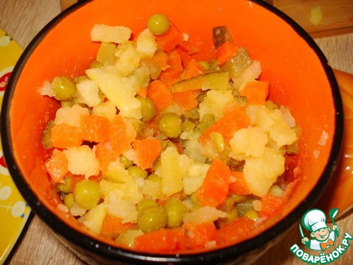 Картофель, морковь смешать с зеленым горошком. ( майонезом не заправлять!!!)