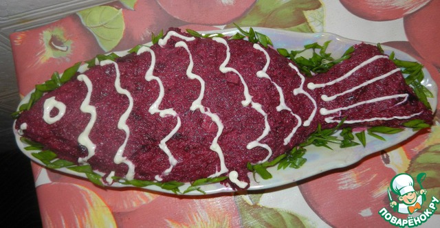 Так вот, свеклу помыть, обсушить, завернуть в фольгу и запечь при 200 градусах примерно 1 час-1:30, зависит от размера. Когда свекла остыла, очистить и натереть на крупной тёрке. Натёртой свеклы получилось около 400 гр. Смешать с рыбой, чуть присолить (аккуратно, рыба тоже солёная) и заправить майонезом.