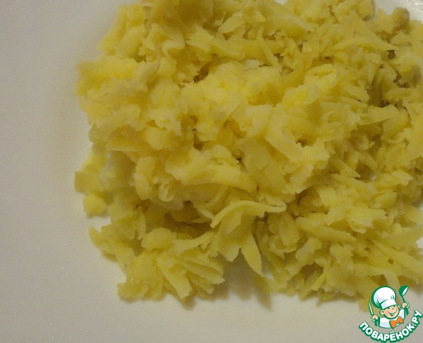 Выкладываем картофель на сельдь. Я выкладываю небольшими порциями и аккуратно распределяю вилкой. Этот слой плотноватый, поэтому его выкладывать несколько тяжеловато, но возможно.