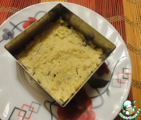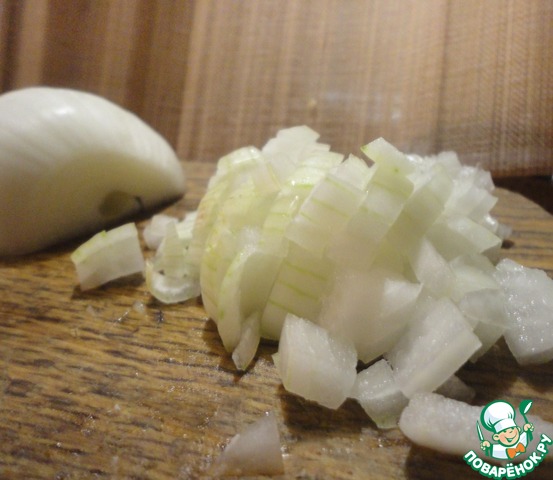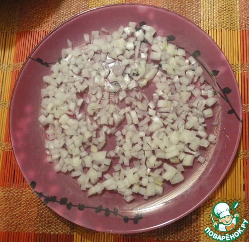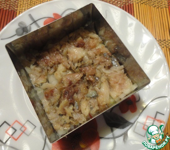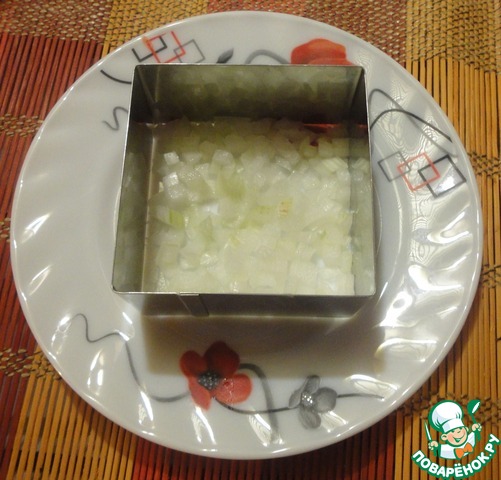Но я решила воспользоваться подаренной мне Наташей (Pingvin72) формочкой для порционных салатов. Вообще, все последние рецепты у меня выходят посвященными ей, т. к. активно пользуюсь содержимым ее мне подарка. Итак, мы отвлеклись. Первый слой лук.