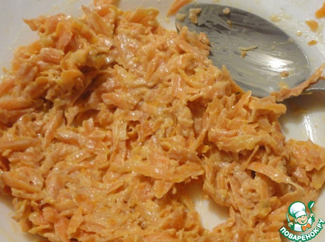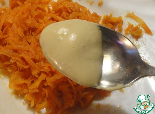 Далее морковвь. Морковь сама посебе сочная, поэтому на нее хватит 2/3 столовых ложек майонеза.