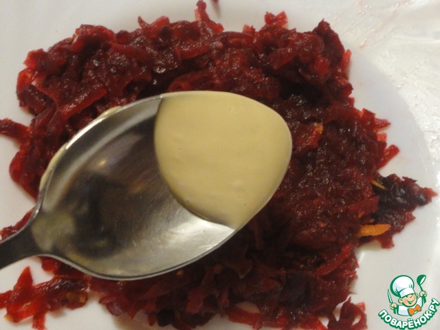 Далее свекла. Это самый сочный овощь. Потому тут вполне хватает 1/3 столовой ложки майонеза. Ну в крайнем случае - 1/2 ст. л. Из тех же соображений (чтобы не добавлять лишней жидкости), я и тут использую соль. Солим сначала немного, пробуем, при необходимости - досаливаем.