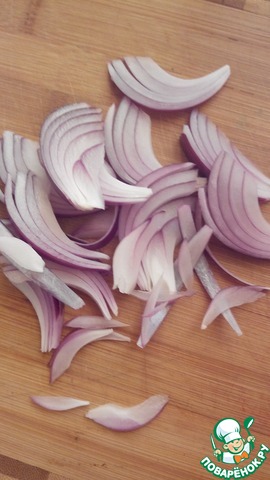 Лук режем тонкими дольками и маринуем в винном уксусе минут 20.