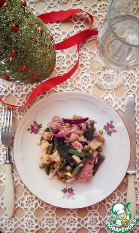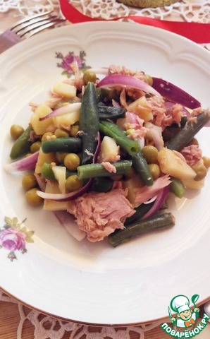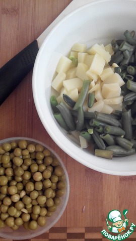 Вареный картофель режем средним кубиком, добавляем стручковую фасоль (предварительно бланшируйте ее в кипящей воде около минуты, затем сразу же ополосните холодной водой) и зеленый горошек